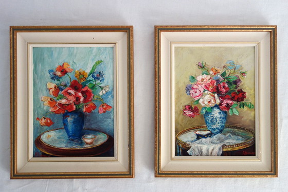 Partij van 2 stillevens boeket bloemen gesigneerd A. Bouquet. Alphonsine Bouquet exposeerde bloemen en stillevens bij de Société Nationale des Beaux Arts (SNBA) en de Salon des Indépendants van 1935 tot 1939. Olieverfschilderij, stanstechniek.