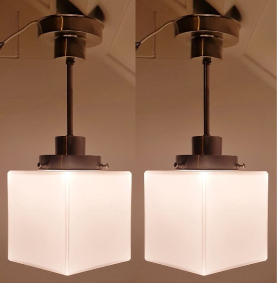 2 Art Deco hanglampen bestaande uit opaline glazen kubus aan een nikkel armatuur.