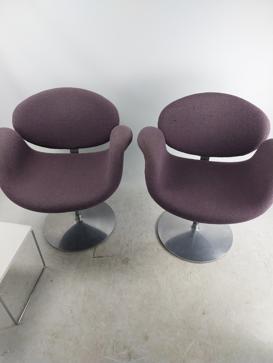 2 Artifort Little Tulip Fauteuils 1960's. In originele paarse bouclé stof door Pierre Paulin. In zeer goede conditie. 1 stoel heeft een haak in de rugleuning. (Zie foto) 68 x 60 x 75cm zh 45cm