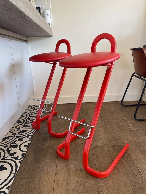 Ontdek de elegante eenvoud van deze twee barkrukken ontworpen door Gaston Rinaldi. Met hun opvallende rood/oranje kleur en strakke lijnen voegen deze krukken een vleugje moderniteit toe aan elke ruimte. Perfect voor een stijlvolle keukenbar of een eigentijdse eetruimte.