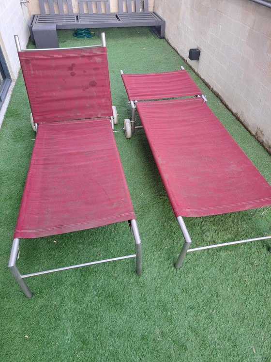 Ontdek de elegante eenvoud van deze moderne ligzetels, ontworpen door Fabiaan Van Severen. Perfect voor uw buitenruimte, deze ligzetels combineren stijl en functionaliteit met een aluminium buisframe en gespannen canvas zitting.