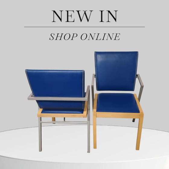 Ontdek deze elegante designstoelen, die de Bauhaus-esthetiek belichamen. Met een harmonieuze combinatie van hout en metaal bieden deze stoelen niet alleen stabiliteit, maar ook een vleugje tijdloos design. De diepblauwe bekleding voegt een modern accent toe aan elke ruimte en zorgt voor comfortabel zitten, mede dankzij de flexibele rugleuning die zich aanpast aan uw bewegingen. Er zijn enkele kleine krasjes aan de voorkant van de armleuningen door contact met een tafelrand, maar deze zijn gemakkelijk bij te werken met een beetje verf.