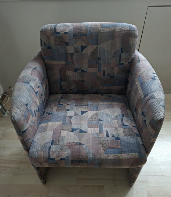 Twee stijlvolle Jori fauteuils met een uniek geometrisch patroon in diverse kleuren. Deze stoelen bieden zowel comfort als een opvallend design, ideaal voor elke woonkamer of leeshoek. De stevige constructie en hoogwaardige textielbekleding zorgen voor duurzaamheid en een luxe uitstraling.