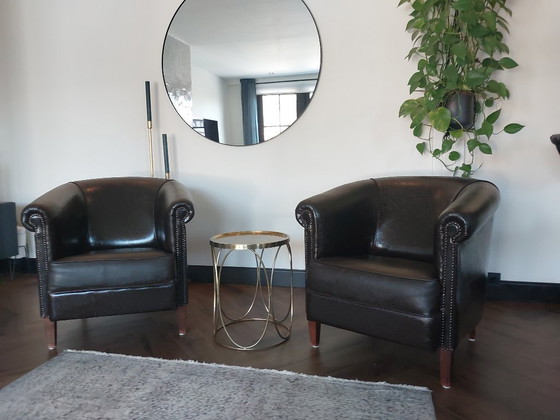 Te koop: set van 2 stijlvolle lederen clubfauteuils. Compact model met ronde armleuningen en siernagels, wat ze een klassieke chesterfield look geeft. Het donkere leer heeft een mooie geleefde uitstraling (patina) en past perfect in een vintage, industrieel of modern interieur.