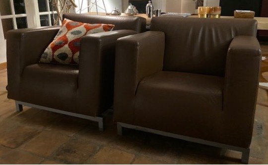 Deze Pastoe Roots fauteuils hebben een lederen bekleding en grijze ijzeren poten. Afmetingen: H 72cm, B 79cm, D 82cm. Eerste eigenaar en gekocht bij erkende design meubelzaak.