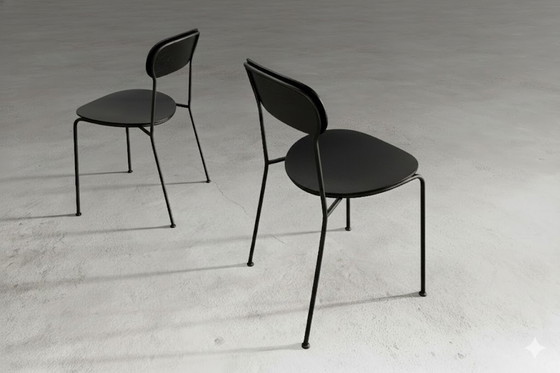 2 stapelstoelen in zwart gelakt eikenhout, met zwart frame