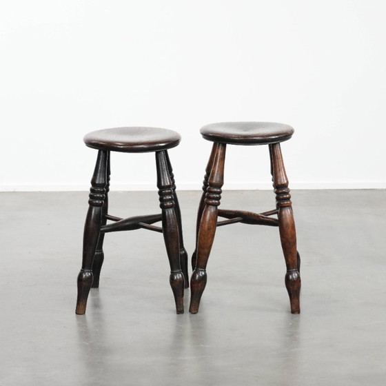 Deze set van twee leuke en subtiele antieke Engelse Windsor krukjes uit de 18e eeuw is een elegante toevoeging aan nagenoeg ieder interieur. Naast dat ze dienstdoen als zitplaats, laten ze zich ook gemakkelijk inzetten voor decoratief gebruik. Door hun leeftijd en jaren van gebruik hebben zij een prachtig patina verkregen en hebben ze een warme, karaktervolle en elegante uitstraling. Ze passen perfect in zowel een klassiek als een modern interieur. Structureel zijn ze in goede en direct inzetbare staat. Bij gepast gebruik en onderhoud zullen ze u nog vele jaren van plezier voorzien!