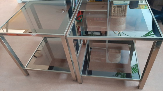 Deze set van twee bijzettafels ( 50x50 ) in Hollywood Regency-stijl ziet er nog heel netjes uit.