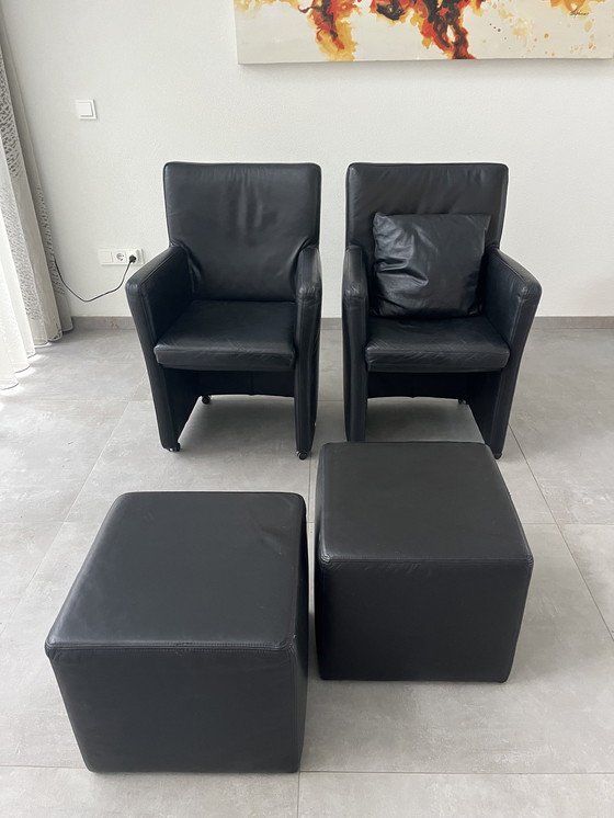 Deze elegante set bestaat uit twee Hukla fauteuils en twee bijpassende poefs, alle vervaardigd uit hoogwaardig zwart leer. Het moderne ontwerp is zowel stijlvol als comfortabel en vormt een perfecte aanvulling op elk interieur. De fauteuils hebben een slank silhouet met comfortabele armleuningen, terwijl de poefs veelzijdig inzetbaar zijn als extra zitplaats of voetensteun. Ideaal voor liefhebbers van eigentijds meubilair met een vleugje elegantie.