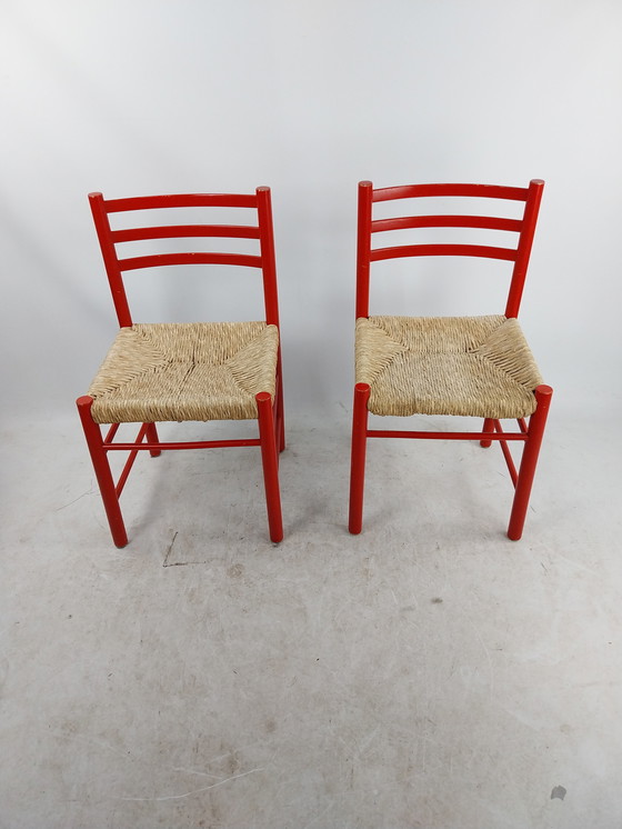 Set van twee rode Scandinavische eetkamerstoelen uit de jaren 1960. Deze stoelen hebben een opvallend rood houten frame en een zitting van gevlochten riet, wat zorgt voor een charmante vintage uitstraling. Perfect voor liefhebbers van retro en Scandinavisch design. De stoelen zijn stevig en comfortabel, ideaal voor dagelijks gebruik in de eetkamer. 43 x 43 x 78cm zh 43cm