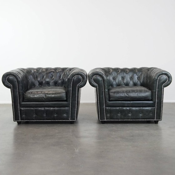 2 x Ruime zwarte chesterfield fauteuil van generfd rundleer