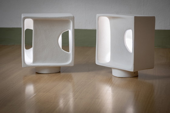 Paar sculpturale tafellampen, model Toro, geïnspireerd op een vuurtoren, in wit chamotte-aardewerk, gesigneerd en genummerd. Geleverd met elektriciteit.