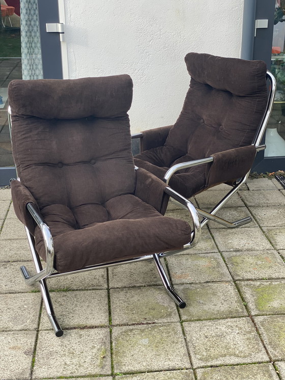 Prachtig paar op Gilles Lundgren geïnspireerde buisvormige chromen fauteuil. In de stijl van Gillis Lundgren maar niet geauthenticeerd. Deze stoelen weerspiegelen de groovy jaren 70. Met vintage bruine corduroy stof die in goede staat is. Met wat gebruikerssporen. Het chroom glanst nog en vormt een heel mooi paar voor vintage tot moderne interieurs. Structuur is uitstekend en zit uiterst comfortabel. Moeilijk om een set te vinden - gezien de leeftijd en de gebruikte materialen. Het werd misschien eind jaren 70, begin jaren 80 geproduceerd. Ze zijn licht van gewicht en heel gemakkelijk te verplaatsen - naar het gebied dat je leuk vindt wanneer je het wilt! Afmeting h 75cm, d 75cm, b 60cm, vloer tot zitvlak 44cm.