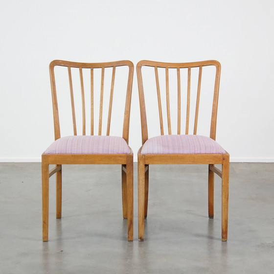 Aangeboden deze leuke set van 2 vintage eetkamerstoelen uit de jaren ’70 met gespijlde rugleuning en stoffen zitting. Deze set van 2 vintage eetkamerstoelen uit de jaren ’70 straalt rust, charme en gezelligheid uit. Ze hebben een houten frame met een gespijlde rugleuning en licht paarse stoffen zitting. Door jarenlang gebruik hebben ze normale gebruikssporen opgelopen en structureel zijn ze in goede en uiteraard direct inzetbare staat. Bij gepast gebruik en onderhoud kunt u nog vele jaren van deze fijne stoelen genieten. Ziet u ze al aan uw eettafel staan? Let op: De afmetingen vermeld in onze advertentie tekst zijn leidend. Foto’s maken deel uit van de omschrijving. Afmetingen: Hoogte: 87 cm Breedte: 46 cm Diepte: 54 cm Zithoogte: 49 cm Zitdiepte: 42 cm Artikelnummer: 28112405