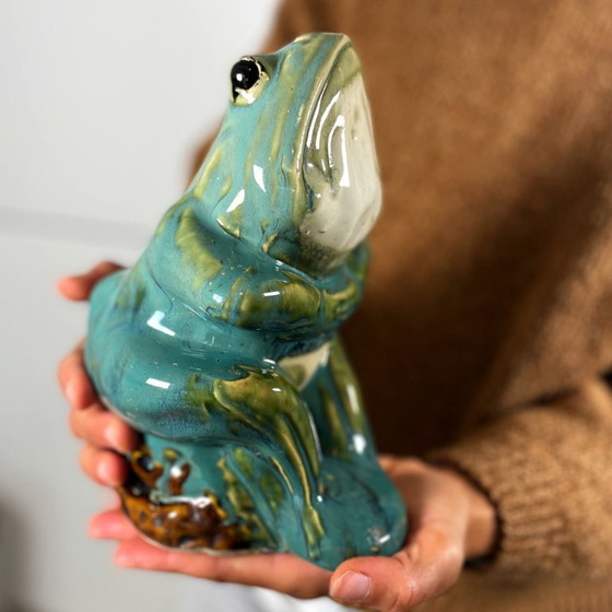 Prachtig geglazuurde majolica kikker uit het midden van de 20e eeuw. De driekleurige groene huid heeft een bijna melkachtige, lavaachtige uitstraling. Het is de unieke glazuur die deze kikker zo bijzonder maakt. Er is speciale zorg besteed aan de anatomie van het beeld en het vakmanschap van het glazuur. De keramische kikker is ongemerkt, maar hij is afkomstig uit Nederland – hoewel deze kikker mogelijk oorspronkelijk uit Frankrijk komt. Hij zit aandachtig, alsof hij klaar is voor een gesprek. Wat een gezellige kerel!