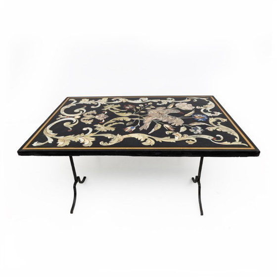 20e-eeuwse Italiaanse handgemaakte salontafel met smeedijzeren frame en ingelegd marmeren blad