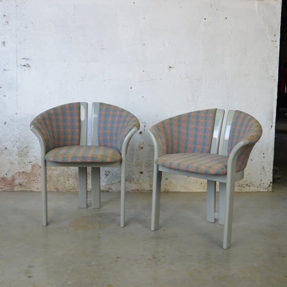 Zeer zeldzame set van 2 Acantus clubstoelen ontworpen door Karl Springer en geproduceerd door Tonon in de jaren 80. Deze stoelen combineren een houten frame met een kleurrijke stoffen bekleding, wat zorgt voor een unieke retro uitstraling. Perfect voor liefhebbers van vintage design.