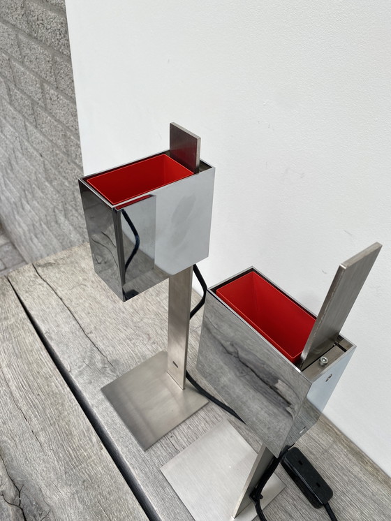 Tafellampjes Alvaline uitgevoerd in de combinatie chroom, rvs en primair rood.