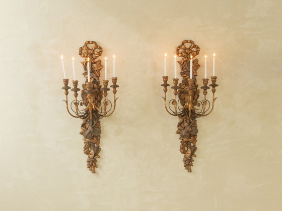 Weelderige wandhouder in barokstijl uit de jaren 1960. Hoogwaardige houten basis met ruimte voor vijf kaarsen per houder. Handgemaakt in Oostenrijk. De aanbieding omvat twee kandelaars. Zeer goed vakmanschap, hoogwaardige materialen, gemaakt in Oostenrijk.