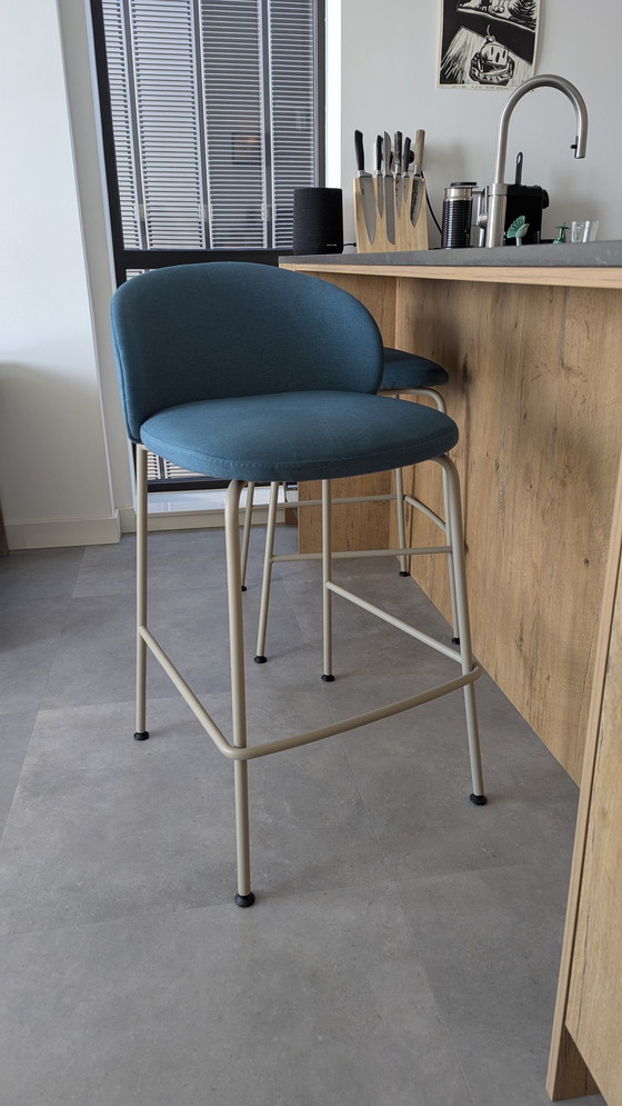 Twee barkrukken van het merk BoConcept, model Princeton. De stofkleur is blauw (petrol), en het onderstel is asgrijs (de krukken zijn in deze samenstelling ook nog nieuw te koop bij BoConcept). Geen beschadigingen of gebruikssporen. Twee jaar oud. De krukken hebben speciale dopjes om het geluid ervan te beperken en de vloer te beschermen. Zitten ook erg fijn door de goede ondersteuning aan de rug.