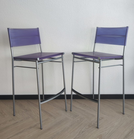 De opvallende paarse zitting en rugleuning, gecombineerd met een slank aluminium kleurig metalen frame, maken deze comfortabele krukken een blikvanger in elke ruimte. Perfect voor een moderne keuken of bar, bieden ze zowel comfort als een vleugje design flair. Mis deze kans niet om een stukje designgeschiedenis in huis te halen.