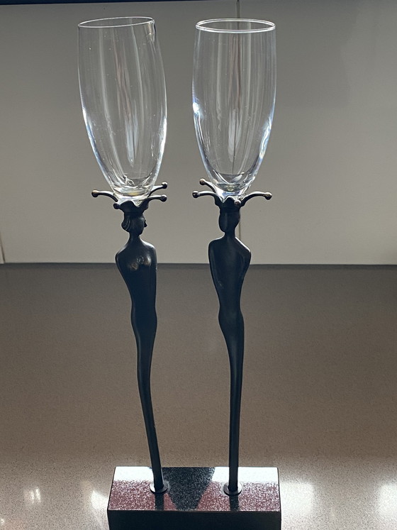 Deze glazen flutes op rank en organisch gevormde bronzen stelen zijn een kunstwerk op zich.