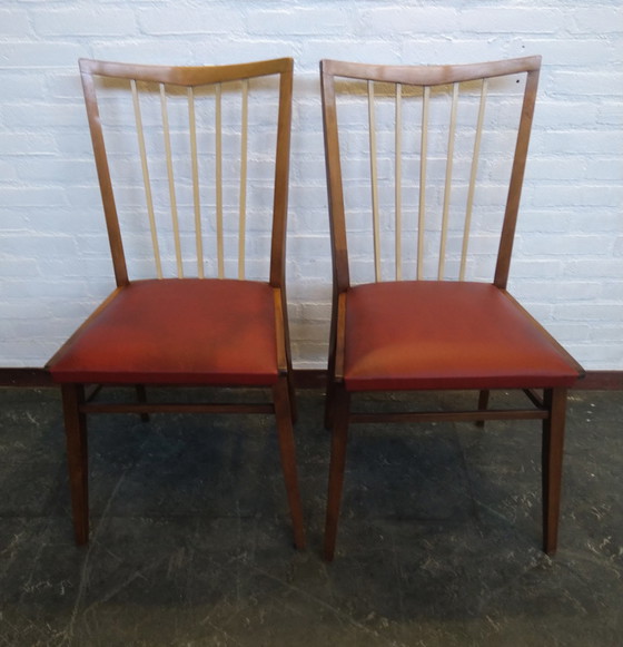 ConditieGoedKleurenRoodMateriaalHout, SkaiAantal stuks2StijlVintageHoogte87 cmBreedte44 cmDiepte44 cmZithoogte46 cmGebruikssporenVerkleuring
