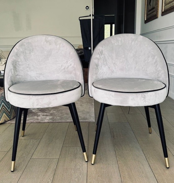 2 Dining Chair Cooper van het merk Eicholtz, in een lichtgrijze velvet, afgewerkt met een donkergrijs/bruine bies.