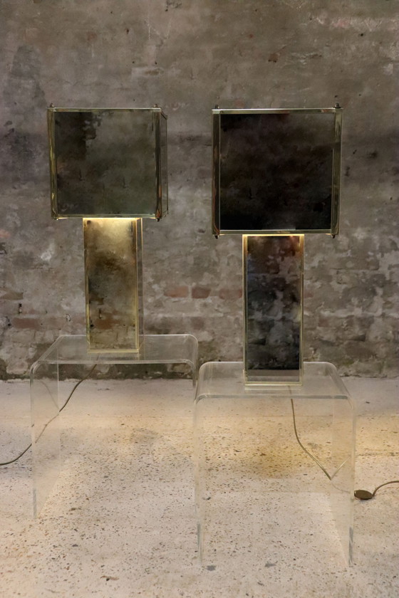 Een opvallend paar sculpturale tafellampen uit het Italië van de jaren 70, die de gedurfde lijnen en architectonische geest van brutalistisch design tonen. Deze zeldzame lampen hebben een geometrische constructie van spiegelpanelen, omlijst met warm messingkleurig metaal. De binnenkant is afgewerkt in wit, wat een zachte, sfeervolle gloed verspreidt wanneer ze branden. Elke lamp staat op een transparante acryl voet, wat een zwevend, modernistisch effect creëert. De prijs is voor de set van 2.
