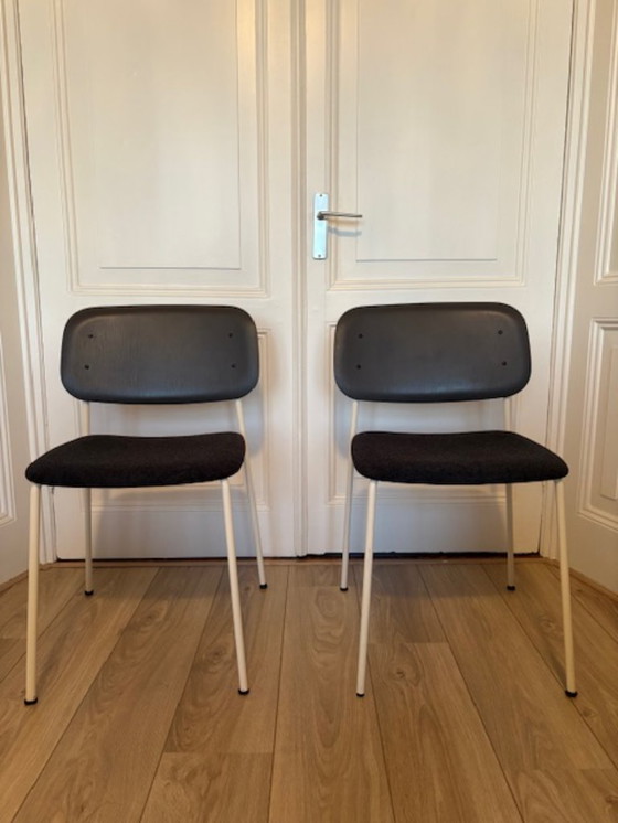 Prachtige designstoel van het Deense merk HAY, model Soft Edge. Comfortabele zitting uitgevoerd in wolvilt, met een houten rugleuning en wit gelakte metalen poten. Tijdloos Scandinavisch design, perfect voor eetkamer, werkplek of vergaderruimte.