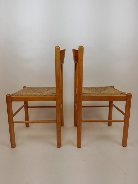 Set van 2 lichte houten vintaghe eetkamerstoelen met biezen zitting in Scandinavische stijl. De stoelen hebben mooie details zoals de rugleuning van gebogen hout en de afgeronde hoeken. In mooie en stevige conditie.