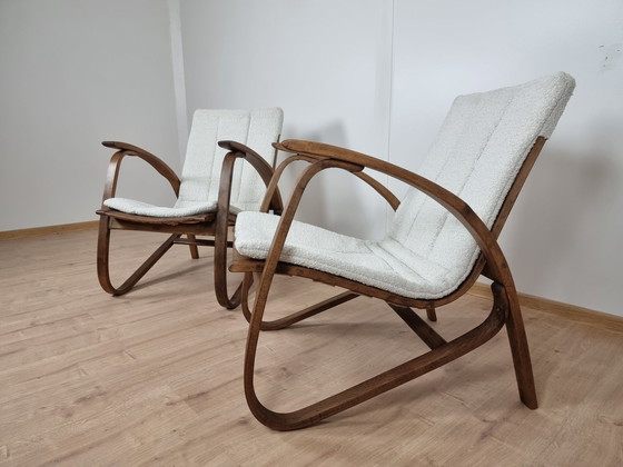 Ontworpen door Jan Vanek in 1930 in Tsjecho-Slowakije. De fauteuils zijn gerestaureerd en opnieuw bekleed. Een klein houten onderdeel ontbreekt, door gebruik en ouderdom.