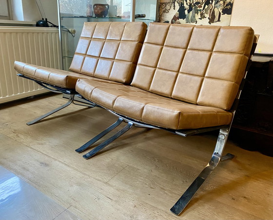 De kunstlederen zittingen vertonen minimaal enkele microgaatjes en -sporen, zie foto's. Het frame in chroom vertoont vlekjes. Er ontbreekt één bout.