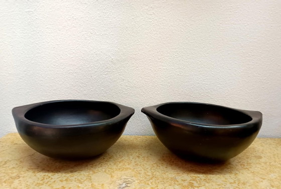 Een paar aardewerken kommen, La Chambra, Colombia, circa 1970. Deze kommen met afgeronde bodems zijn handgemaakt in Colombia door leden van het inheemse Pijao-volk. Geschikt voor oven- of fornuisbakken. De klei houdt de warmte vast, waardoor een langzame en gelijkmatige bak mogelijk is.