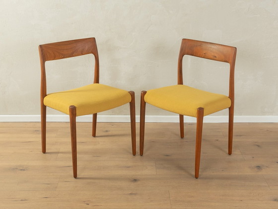 Model 77 eetkamerstoelen uit de jaren 1950 van Niels O. Møller. Massief teakhouten frame. De zittingen zijn opnieuw bekleed en bekleed met een klassieke stof in mosterdgeel. De aanbieding omvat 2 stoelen. Gemaakt in Denemarken. Ontwerp: Niels O. Møller, fabrikant: J.L. Møllers Møbelfabrik.