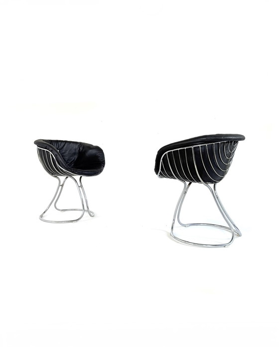 De voet loopt over in een bolvormige kuip. Sierlijk frame een lust voor het oog. De fauteuils hebben een gevoerde zitting van zwart leer. Nog in mooie rijke staat. Een prettige zachte zit. Leuke set in nette staat. Ook geschikt om vrijstaand in een ruimte te plaatsen.