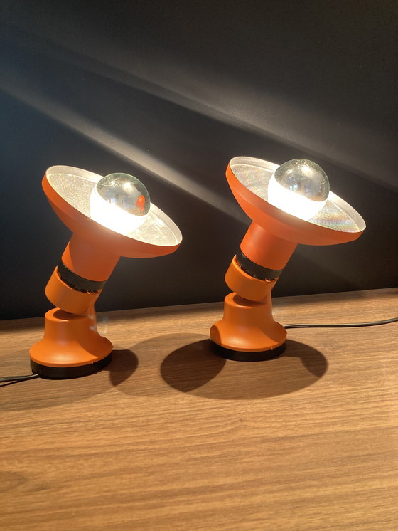 2 stuks vintage Philips spots / wandlampjes / plafondlampjes uit de jaren 70 (staan in Philips catalogus uit 1979). In zeer mooie en orginele oranje staat (niet overgespoten). Mooi met spiegelkoplamp (zit niet in de prijs), standaard grote fitting. Spots zijn kantelbaar. Zwarte ronde grondplaat is eraf te schroeven zodat kabel via achterkant of zijkant doorgevoerd kan worden. Diameter kap 15 cm. Unieke set in deze staat en kleur.