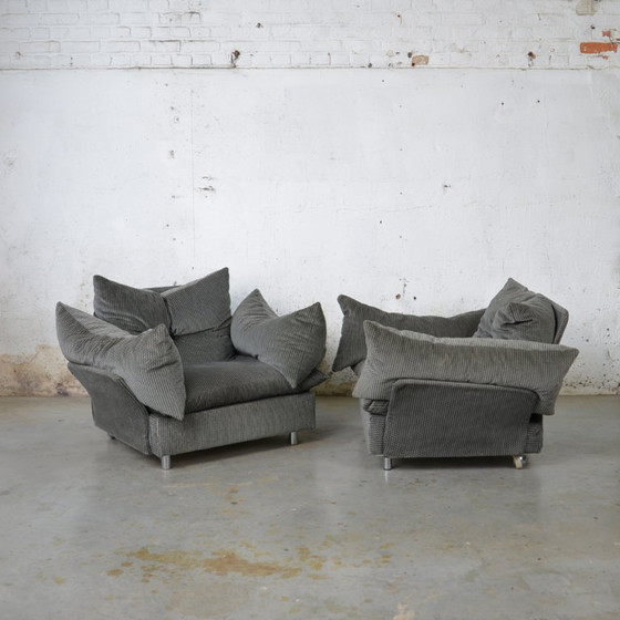 Set van 2 stijlvolle pop art clubs uit de jaren '70. Deze stoelen combineren grijze alcantara stof met chromen details voor een moderne uitstraling. Perfect voor liefhebbers van retro design.