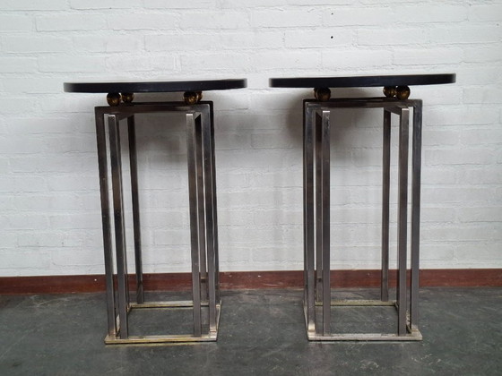 2x Regency-stijl bijzet- of plantentafels. Deze tafels zijn perfect voor het tentoonstellen van uw favoriete planten of decoratieve objecten. Het strakke metalen frame en het zwarte houten blad stralen een tijdloze charme uit die naadloos in elke ruimte past. De gouden accenten voegen een subtiele luxe toe, waardoor deze tafels een blikvanger zijn in elke kamer. Gebruikssporen aanwezig. De prijs is voor de set.