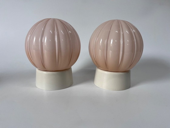 Prachtige set van twee roze Thabur plafondlampen van rond 1930. De lampen zijn in goede staat en voorzien van crème bakelieten armaturen. Deze originele armaturen kunnen enige kleine plekjes van verkleuring bevatten. Glas in keurige staat. De lampen zijn gereed voor gebruik uiteraard!