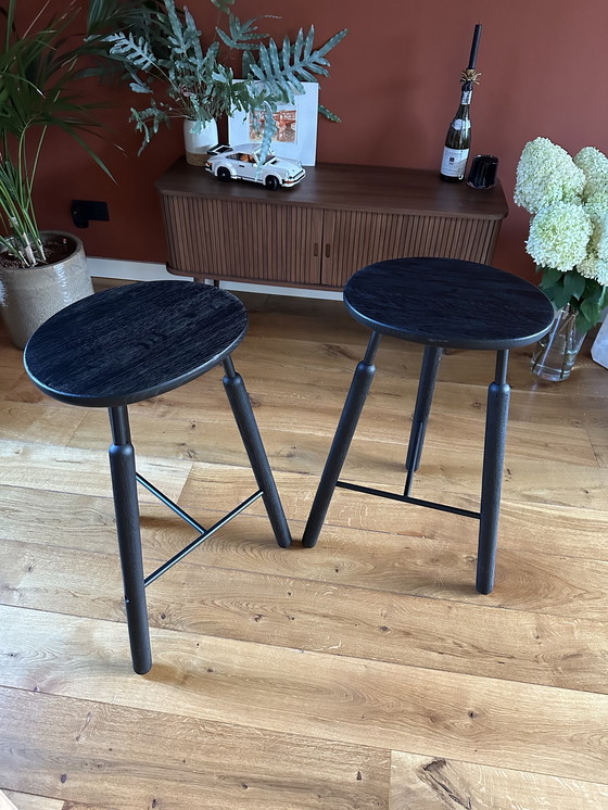 Deze &Tradition barkrukken zijn een perfecte mix van stijl en functionaliteit. Ze zijn 72 cm hoog en hebben een slanke zwarte afwerking die bij elk modern interieur past. Deze barkrukken zijn gemaakt van hoogwaardig hout en metaal en zijn ontworpen voor duurzaamheid en comfort. Ideaal voor uw keuken of bar, ze bieden een chique zitoplossing die uw ruimte verbetert met een eigentijdse touch. Zijn beide in goede staat met minimale gebruiksporen.