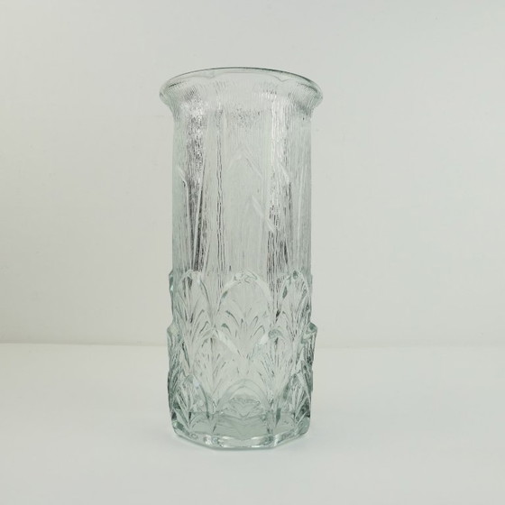 Deze vaas komt uit de jaren 60-70 uit Noord-Italie en is een zwaargewicht! Het geperste glas is helemaal intact en lijkt op een plant met daaruit komende stengels, maar dat is onze interpretatie. De vaas is helemaal intact, geen zichtbare krassen, chips of waterschade.