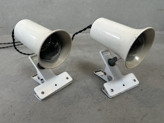 2x originele stevige klemspot. Industrieel karakter. Wit. Vernieuwde gevlochten bekabeling. Robuust. Ideaal om de boekenkast of een kunstwerkje te verlichten. Porseleinen e27 fitting. Afmetingen kap. Hoogte: 10cm. Diameter: 7cm. Knijper kan je ook gewoon aan een haakje hangen. Kap beweegbaar in alle richtingen. Bij 1 klem (aan de achterzijde) de boodschap ‘vrije tijd’ gekerfd. Gewicht: 800g. Gemerkt.