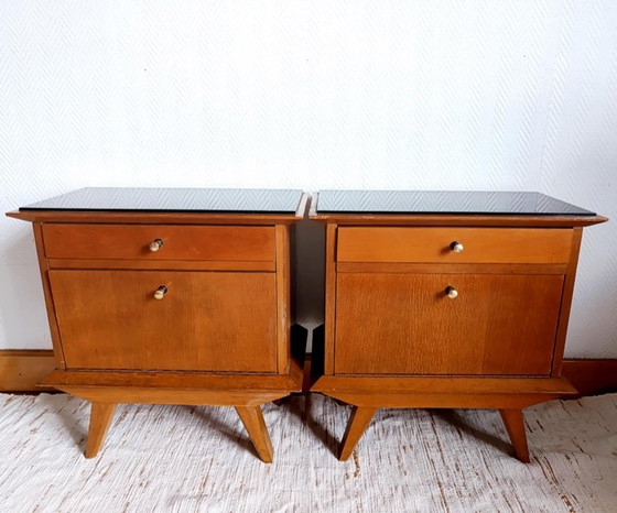 Paar vintage houten nachtkastjes, circa 1960, met zwarte glazen bovenkanten (de bovenkanten zijn vast). Elk kastje heeft een scharnierend deurtje aan de voorkant en een kleine lade, beide met gouden knoppen. Een echt vintage en charmant paar.