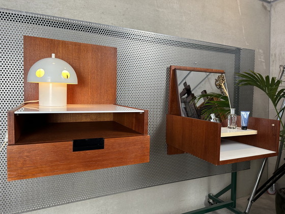 Zeldzame set van twee “Japanse serie” nachtkastje/toiletkastje ontworpen door Cees Braakman voor Pastoe. Het gaat hier om het EU11 kastje met een opklapbare spiegel en de NU11 met het gekende greepje in de lade en een wit plexi (nieuw) bovenblad. Beide kastjes verkeren in een nette staat met lichte sporen van gebruik (hier en daar kleine stukjes fineerverlies aan de randjes) . Bij het toiletkastje werd achteraan de fineer hersteld (zie laatste foto) maar daar zie je niets van als de spiegel is open geklapt. De kastjes hangen blind aan de muur en kunnen vrij in de ruimte worden opgehangen of worden gebruikt als nachtkastje naast het bed. Afmetingen: 46 cm breed, 59 cm hoog en 46-48 cm diep. (Zie pagina uit folder Pastoe). Prijs is voor de set. Gemerkt achteraan.