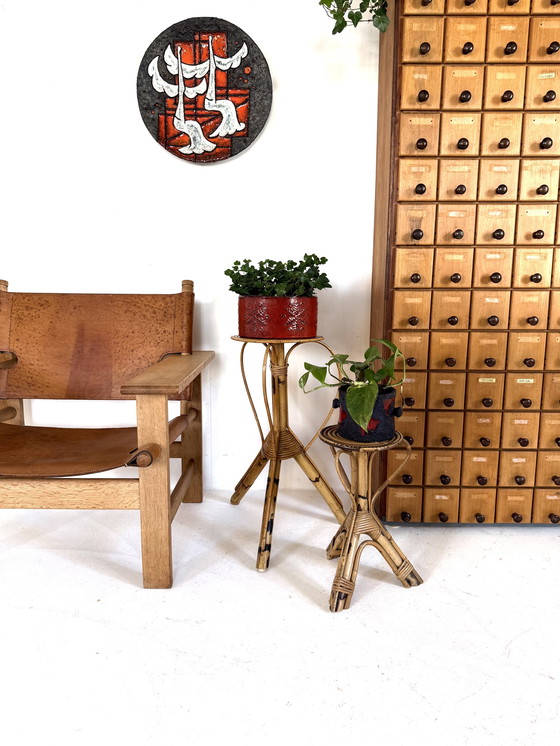 Bijzonder en zeldzaam setje. Met de hand vervaardigde plantenstandaards op 2 diverse hoogtes. Sierlijk vormgegeven met gebogen rotan. Leuke eye-catcher in winkel, etalage of natuurlijk gewoon thuis.