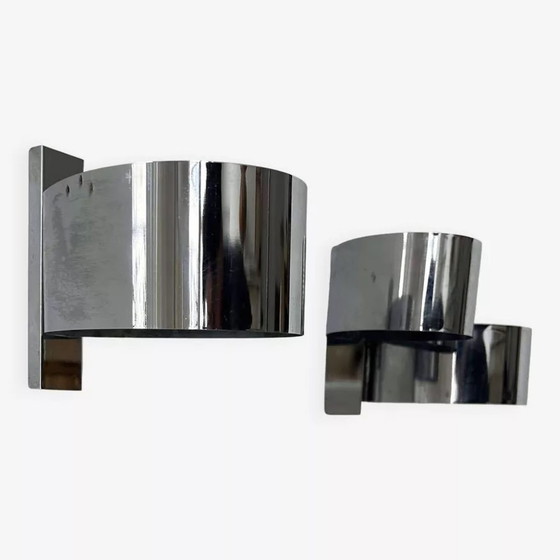 Wandlampen samengesteld uit twee gebogen platen van verchroomd metaal, die indirecte verlichting en een tijdloos design bieden. Een dubbele, een enkele.e14 lamp, led compatibel, elektriciteit gecontroleerd, klaar om te monteren. Afmetingen van de enkele: 17cm diep, 12cm breed, 14cm hoog.