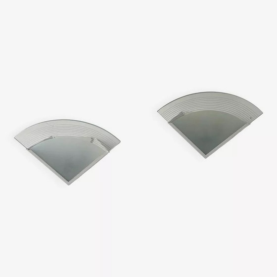Paar wandlampen geproduceerd in Frankrijk in de jaren 70. Het onderste deel van het glas is gezandstraald om de lampen te verbergen en een warm licht te verspreiden. Bovenaan creëren de strepen tussen het gezandstraalde en ongezandstraalde glas een lichtspel. Twee e14-lampen per wandlamp, geschikt voor led, elektriciteit gecontroleerd. Klaar voor installatie. Ref: 17.
