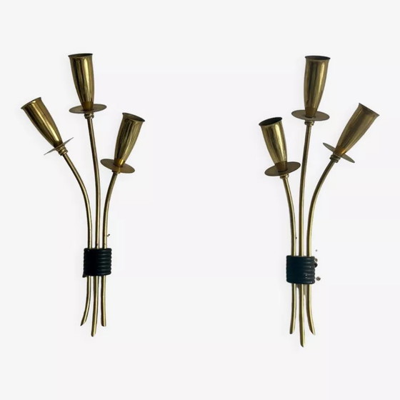Paar massief messing wandlampen geproduceerd in Frankrijk in de vroege jaren 50. Slanke vorm, puur design en hoogwaardige materialen komen samen in deze wandlampen. Elektriciteit gecontroleerd. 3 b14-lampen per wandlamp. Eenvoudige bevestiging met twee schroeven.