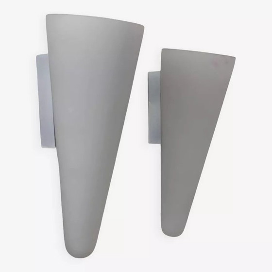 Paar wandlampen (een derde is beschikbaar) in opaal gezandstraald glas, waardoor de klassieke opaline een matte afwerking krijgt en het licht tegelijkertijd warm wordt verspreid. Geproduceerd in Frankrijk in de jaren 1970. Conisch ontwerp, mooi vanuit alle hoeken, tijdloos. E27 lamp, geschikt voor LED, klaar om te monteren.